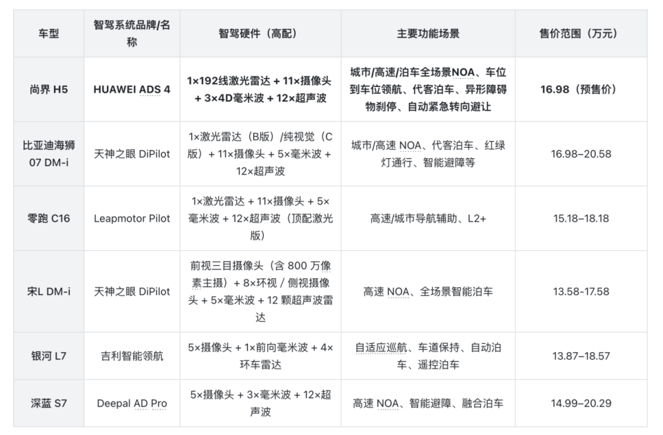 至于智驾层面,这绝对是尚界H5的强项:192 线激光雷达 + 华为ADS4——城区 NOA、代客泊车、哨兵模式,一次给齐。给个表格大家,就知道尚界H5的智驾属于什么水平了。