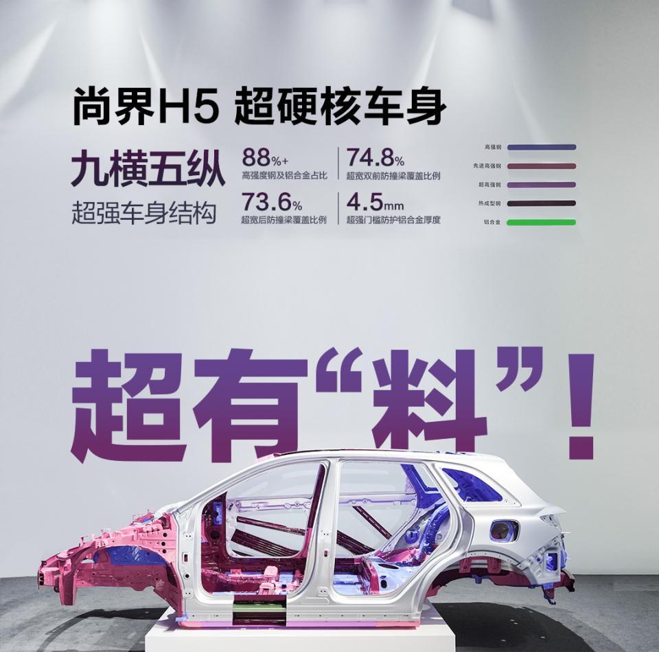 最后,也是大家颇为关心的安全和用料问题。毕竟价格门槛低是大家喜闻乐见的事,但谁都不希望用料缩水对吧。所幸的是,尚界H5不光高强钢占比 88%、热成型钢 25%,还全系用上宁德时代电池。光是电池这块,宁德时代的高成本已经是业界皆知的。